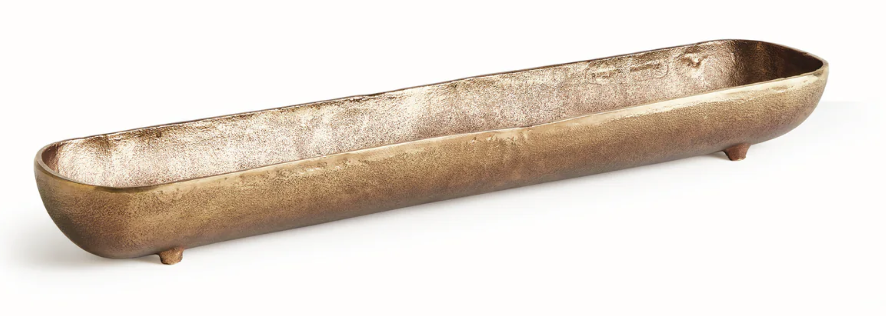 A narrow, curved form and simple design make this cast aluminum tray unique. Line with a collection of candles, or accessorize with whatever fits your style for a contemporary touch.