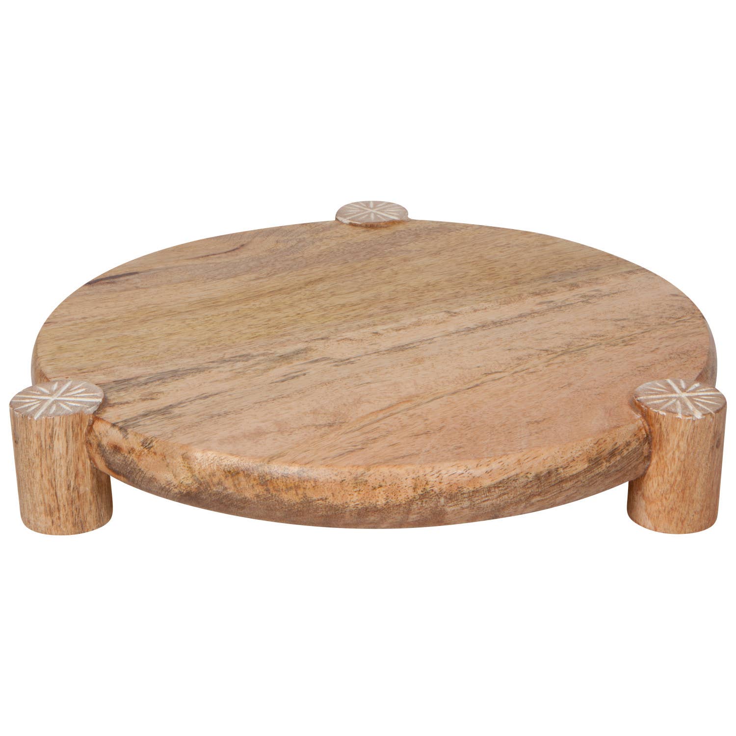 White-washed, hand-etched patterns on natural mango wood create a beautiful effect on statement serving pieces.